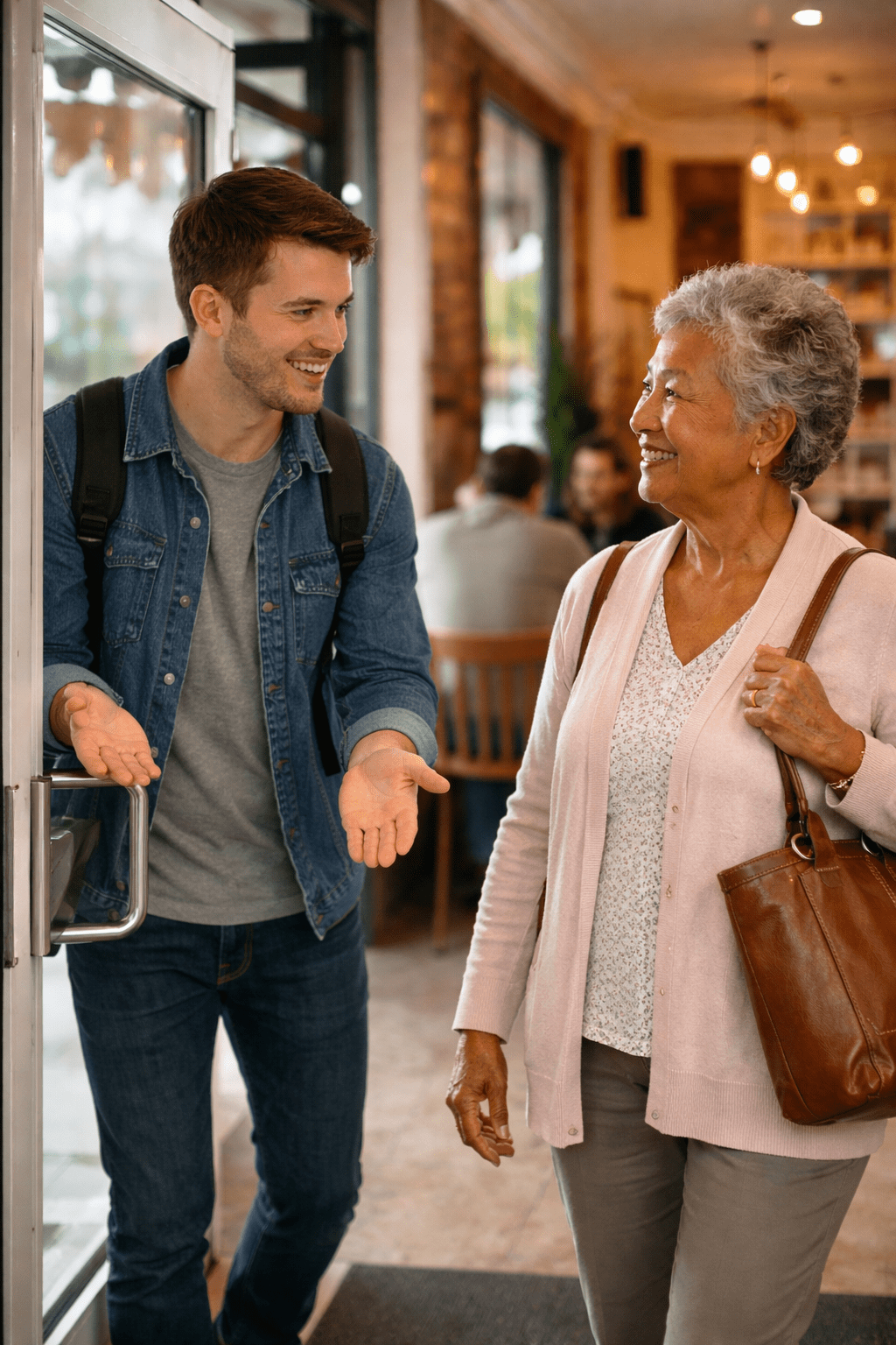 Context matters — letting someone go first can be informal politeness, deference to age or need, or a hurried convenience. If the person is elderly, carrying a child, or appears rushed, a concise, grateful response is best. In workplaces or with acquaintances, a brief reciprocal offer can strengthen rapport without making things awkward.
